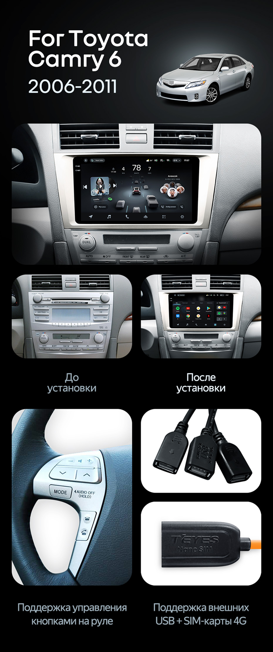 Штатная магнитола Teyes CC4 6/64 Toyota Camry 6 XV 40 (2006-2011) F1 - купить всего за 47 000 руб. в интернет-магазине в Новосибирске Teyes.com.ru. ✓ Самый лучший выбор мультимедиа ✓ Лучшая замена штатному ГУ ✓ Тел. +7 (800) 775-31-74